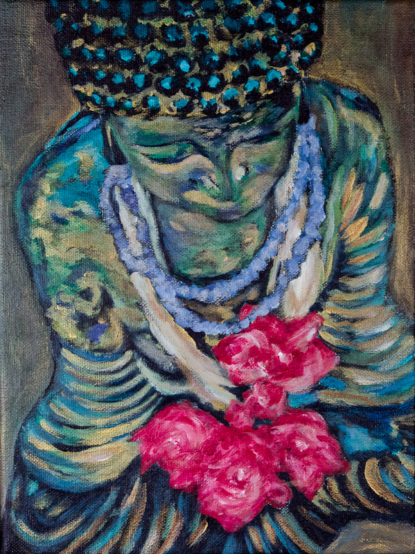 I learned how to laminate mulberry paper this past fall and chose a funky layout to portray this happy woman shopping. I haven’t done collage for a long time and it was a fun diversion from painting. I brought down to Mexico enough silk mulberry paper and other papers with leaves impeded (such as mango leaves) to do 3 more of these. Alas, I haven’t gotten around to them yet. But this one sold the first time I displayed it so that should be incentive for me.